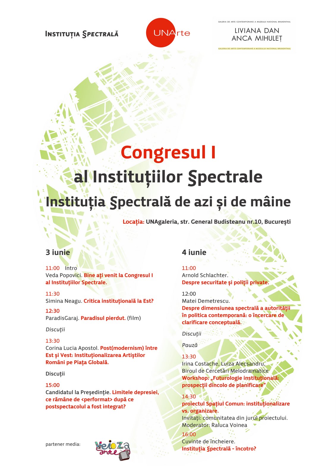 Participating institutions: The Bureau of Melodramatic Research, The Blind Museum (Veda Popovici) Kunstahlle Batistei & ParadisGaraj (Claudiu Cobilanschi), PARApolice (Arnold Schlachter), The Presidential Candidacy, The Department of Art in Public Space (Raluca Voinea, E-cart.ro), The Museum of Modest Art of the Apartment – MAMA.